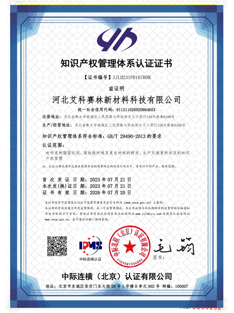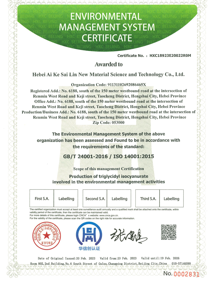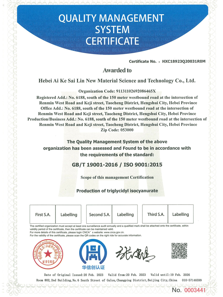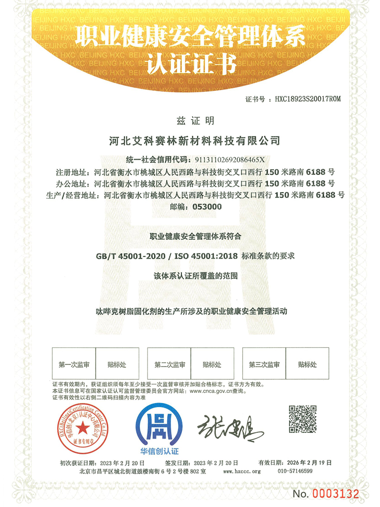 河北艾科賽林新材料科技有限公司成立于2009年,坐落在河北衡水桃城省級高新技術產業園區,占地100畝,注冊資金2500萬元,是一家以粉末涂料固化劑及高性能特種材料研發、生產、銷售為一體的高新技術企業。在激烈的市場競爭中不斷壯大,產品憑借良好的信譽與精益求精的工藝,在市場中取得良譽和好評。公司已通過ISO9001質量管理體系,IS014001環境管理體系、ISO45001職業健康安全管理體系。公司被認定為“高新技術企業”,河北省“專精特新”中小企業,先后獲得河北省行業“技術創新先進企業”,桃城“校企合作創新優秀企業”、畝均“納稅貢獻先進企業”等榮譽稱號......